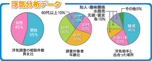 浮気について、相談件数の男女・調査対象者の年齢・浮気相手と出会った場所について分析したデータがあるので、ご覧下さい。