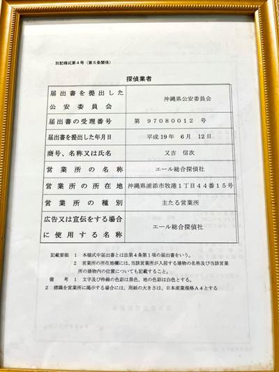 沖縄県公安委員会探偵業届出証明書番号:第97080012号